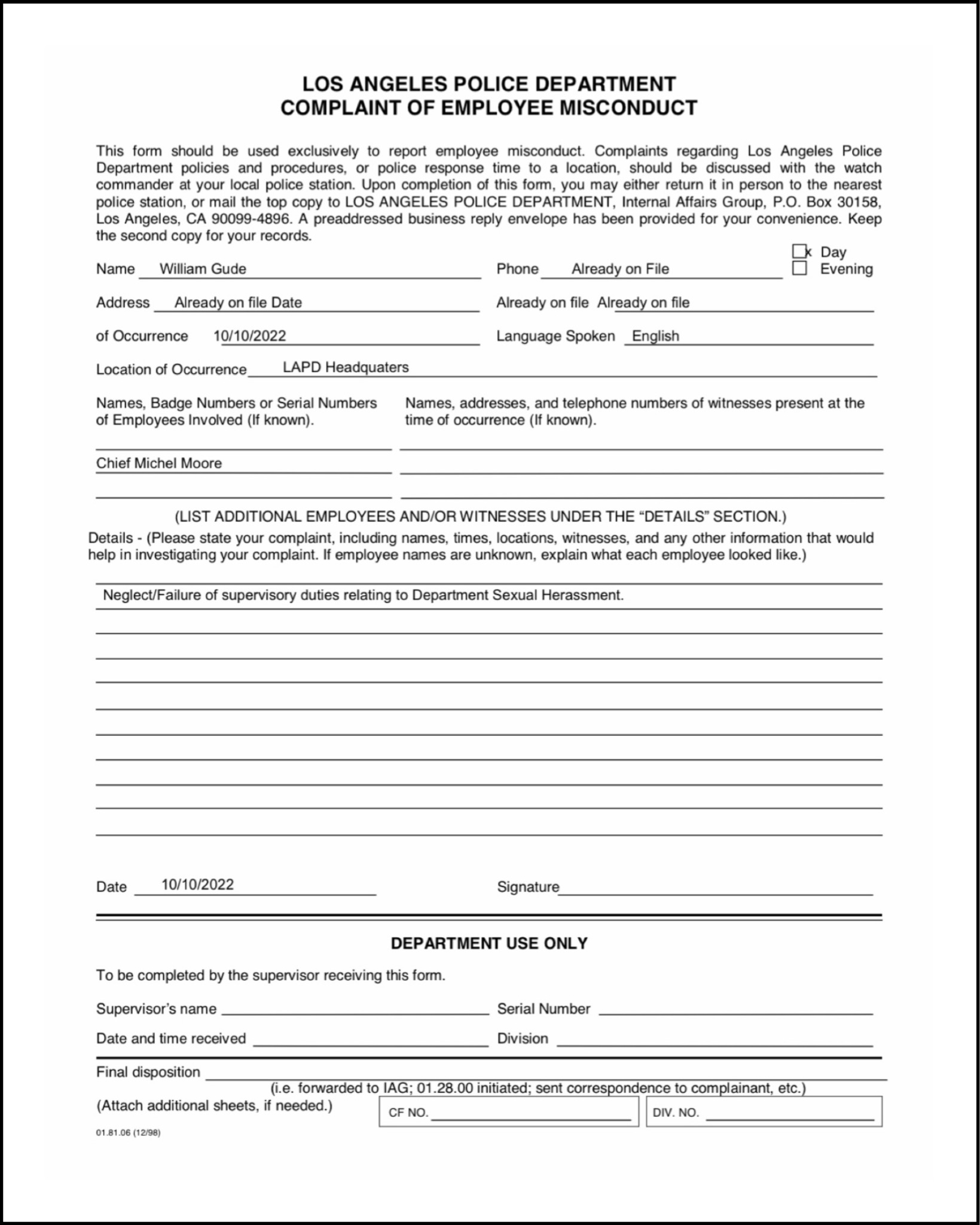 In court, Moore admitted he refused to act on the victim’s request because he feared the matter might go “viral” — an indefensible excuse for any leader, let alone the city’s top law enforcement officer. A formal complaint was later filed against him for neglect of supervisory duties, but the Commission under Gerges Shields adjudicated it as “Unfounded.” A jury disagreed.