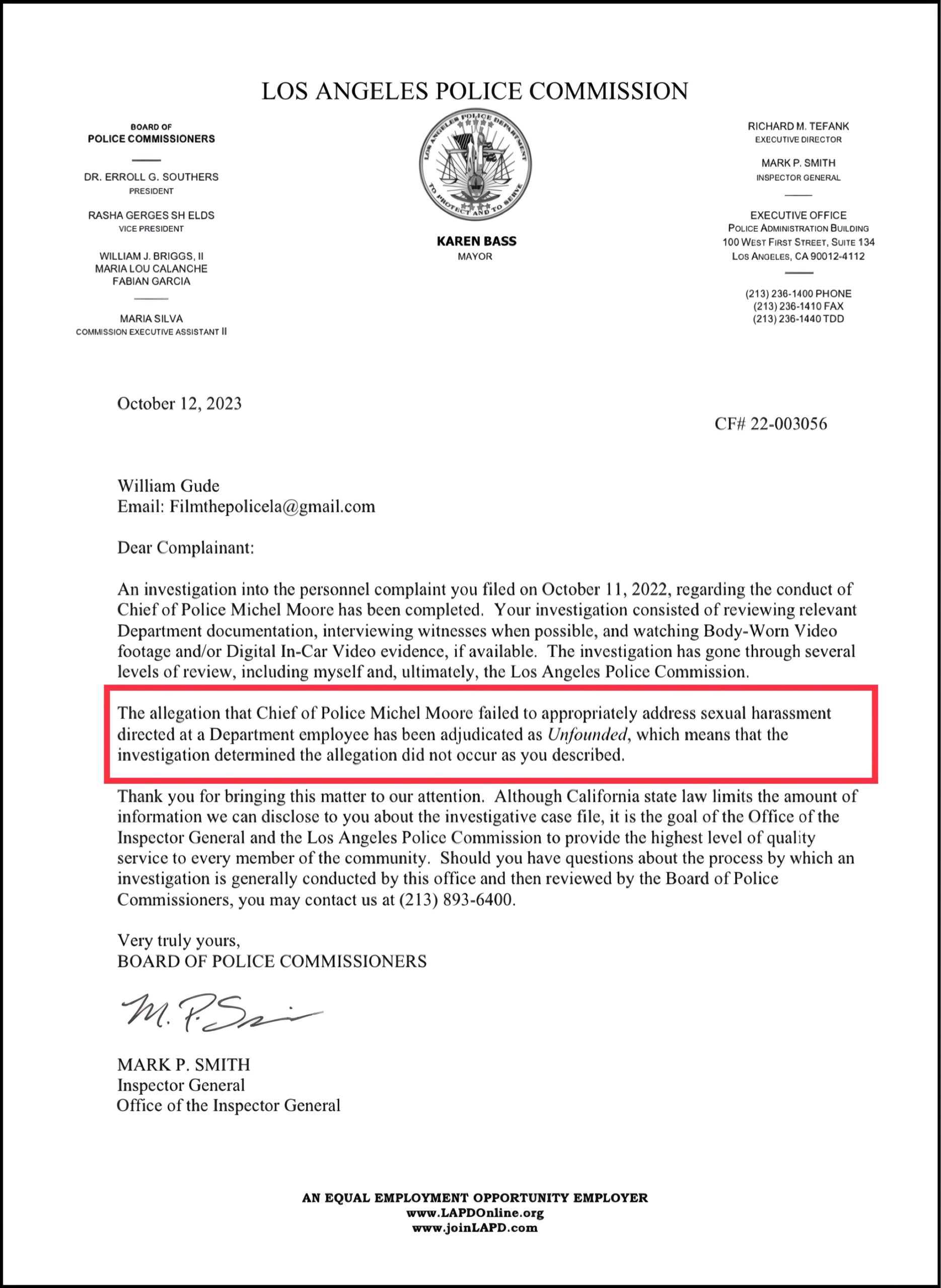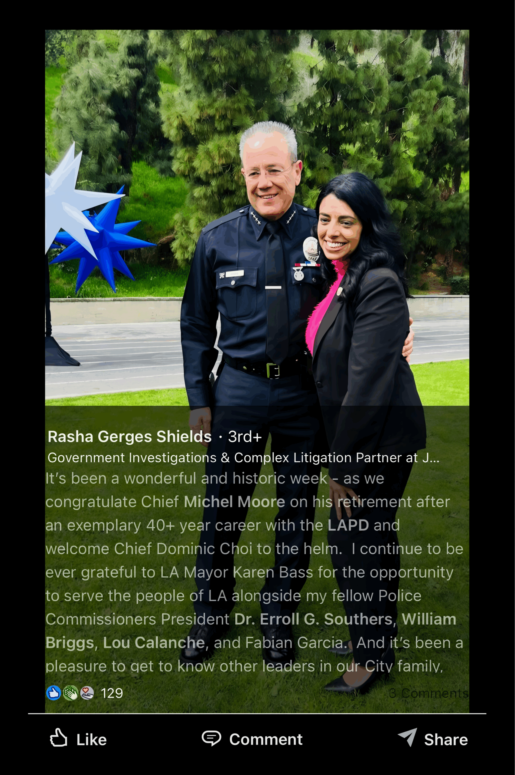 Moore’s own testimony confirmed misconduct, yet Gerges Shields never once publicly criticized him. Worse, only months after the Commission cleared him, Gerges Shields praised Moore for having an “exemplary” career — effectively rewarding a chief whose negligence enabled sexual harassment inside the LAPD.